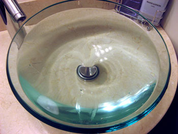 This custom bathroom features a unique glass sink which adds to the decorum in a transparent way. As the water flows through the sink, an artistic element is added by functionality. The sink is not only beautiful but functional as well. The dark green tile flooring compliments the sink.